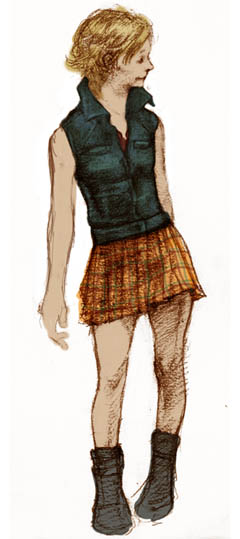 ヘザーという名前は『エクソシスト』の「ヘザー・オルーク」、あるいは『ブレア・ウィッチ・プロジェクト』の「ヘザー・ドナヒュー」とホラーファン受けする答えをしたいところですが……実はヘザー役を演じたヘザーさんからいただきました。このデザインのひらひらのフレアスカートもやってはみたかったんですが、これも“長い髪”と同じ理由で没になりました。なお、全てのデザインに胸ポケットがあるのは、シリーズを通してやっている人にはすぐわかると思いますが、ライトをさすためです。